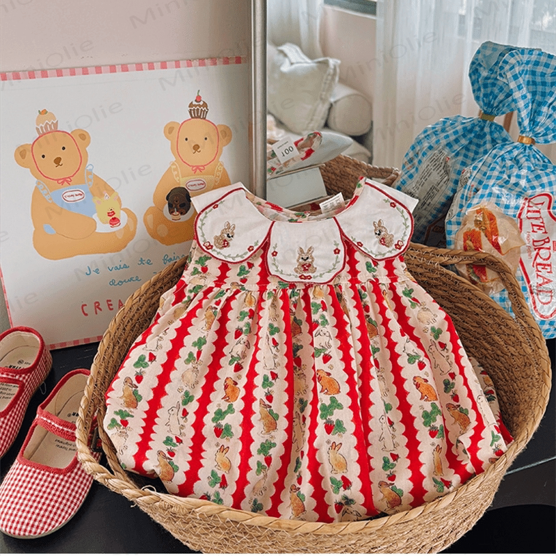 Toddler Red Embroidered Bunny Strawberry Dress